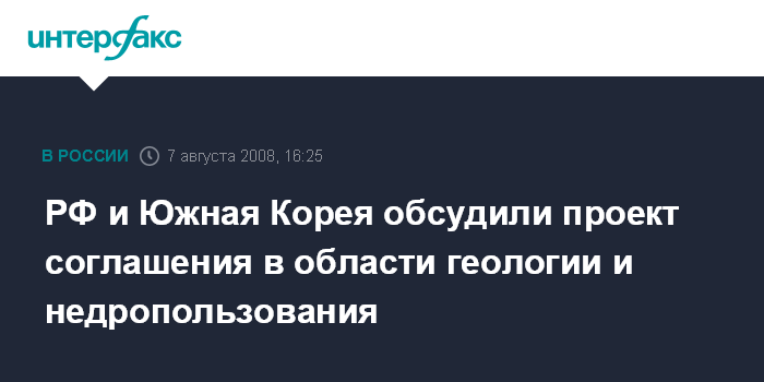 Москва. 7 августа. INTERFAX.RU - Министерство природных ресурсов и экологии РФ (МПР) и министерство экономики знаний Республики Корея окончательно согласовали проект соглашения о сотрудничестве в области геологии и недропользования, говорится в сообщении российского ведомства. Соглашение будет подписано осенью 2008 г. в Москве в ходе в ходе российско-корейского саммита.