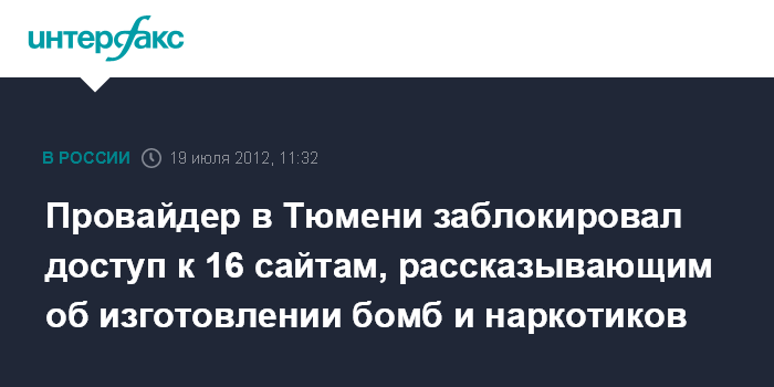 Москва. 19 июля. INTERFAX.RU - По требованию прокуроров в Тюмени закрыт доступ к интернет-сайтам, которые рассказывали, как можно изготовить бомбу и наркотики.