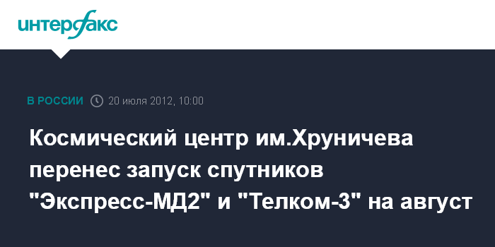 Москва. 20 июля. INTERFAX.RU - Планировавшийся на 26 июля запуск с космодрома Байконур (Казахстан) телекоммуникационных космических аппаратов "Экспресс-МД2" (Россия) и "Телком-3" (Индонезия) перенесен на август, сообщает пресс-служба Космического центра им.Хруничева.