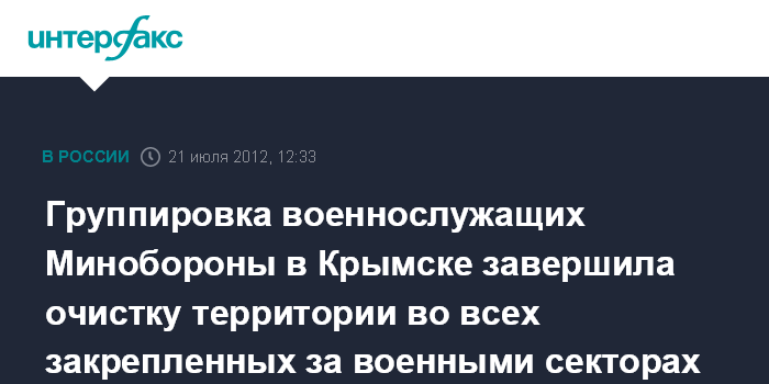 Москва. 21 июля. INTERFAX.RU - За истекшие сутки военнослужащие Минобороны, командированные на ликвидацию последствий наводнения в Крымске, полностью очистили от завалов 60 домов и подворий, а также 12 км дорог.