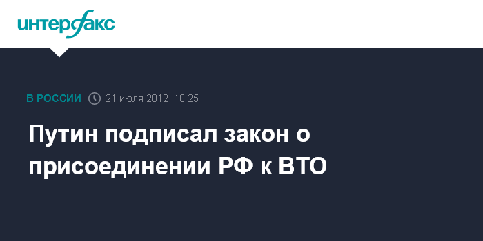 Москва. 21 июля. INTERFAX.RU - Президент России Владимир Путин подписал федеральный закон "О ратификации Протокола о присоединении РФ к Марракешскому соглашению об учреждении Всемирной торговой организации от 15 апреля 1994 г.", сообщили в пресс-службе Кремля. Этим протоколом оформляется членство Российской Федерации во Всемирной торговой организации. Данный ратификационный закон был принят Государственной Думой 10 июля 2012 года и одобрен Советом Федерации 18 июля.