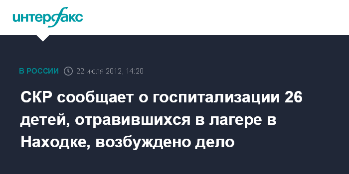 Москва. 22 июля. INTERFAX.RU - В Приморском крае возбуждено уголовное дело по факту массового отравления детей в оздоровительном лагере "Мечта", сообщает в воскресенье сайт СК РФ. "22 июля в правоохранительные органы поступило сообщение о госпитализации в инфекционное отделение больницы города Находки 26-ти детей и одного взрослого из детского лагеря "Мечта" с диагнозом: "острый гастроэнтерит"", - говорится в сообщении.