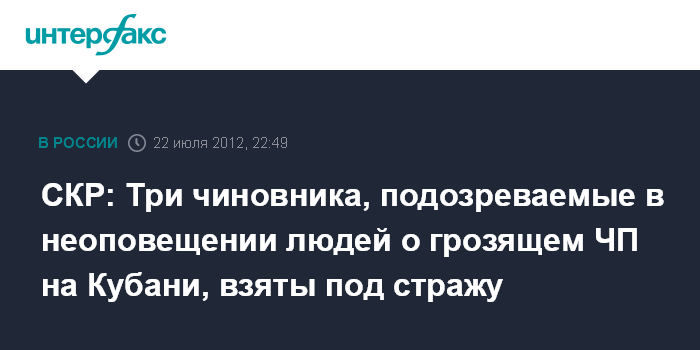 СКР: Три чиновника, подозреваемые в неоповещении людей о грозящем ЧП на Кубани, взяты под стражу