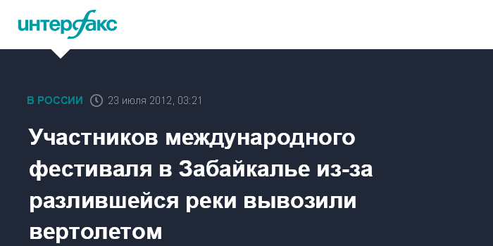 Благовещенск. 23 июля. ИНТЕРФАКС-ДАЛЬНИЙ ВОСТОК - Участников туристического фестиваля "Кодар 2012" в Забайкалье вывозили на вертолете, сообщает ГУ МЧС РФ по Амурской области.