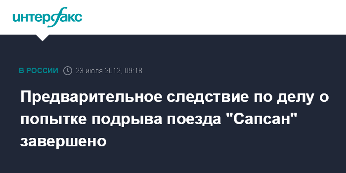 Москва. 23 июля. INTERFAX.RU - ФСБ России завершило расследование громкого уголовного дела о попытке подрыва пассажирского поезда "Сапсан" на маршруте Москва-Санкт-Петербург летом 2011 г., сообщает "Коммерсант" в понедельник.