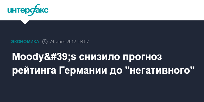 Москва. 24 июля. INTERFAX.RU - Международное рейтинговое агентство Moody's Investors Service снизило прогноз рейтинга Германии до "негативного" со "стабильного", указав на растущие риски в связи с долговым кризисом в еврозоне, в результате которого финансовая помощь может потребоваться Испании и Италии.