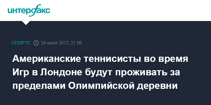 Москва. 24 июля. INTERFAX.RU - Сборная США по теннису официально объявила, что не поселится в Олимпийской деревне, а разместится в пятизвездочном отеле неподалеку от кортов Уимблдона, на которых пройдут теннисные поединки Игр-2012.