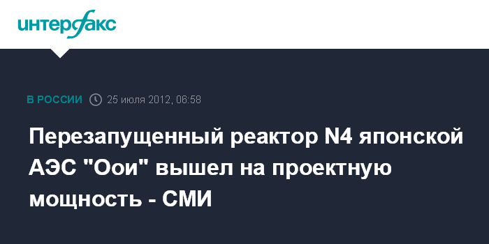 Как сообщалось, реактор N4 АЭС "Оои" в префектуре Фукуи на западе Японии "достигнув критичности", возобновил работу рано утром в 19 июля вслед за перезапущенным 9 июля реактором N3. Генерировать электричество N4 начал 21 июля, а выйти на проектную мощность должен был как раз 25 июля.
