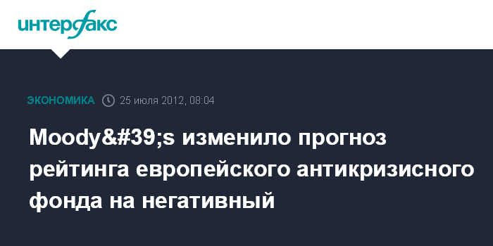 Москва. 25 июля. INTERFAX.RU - Международное рейтинговое агентство Moody's Investors Service изменило прогноз рейтинга европейского антикризисного фонда European Financial Stability Facility (EFSF) на "негативный" со "стабильного" - вслед за снижением прогнозов рейтингов Германии, Нидерландов и Люксембурга.