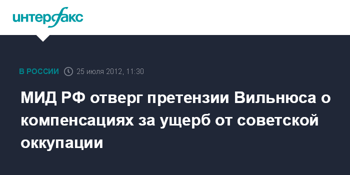 Москва. 25 июля. INTERFAX.RU - МИД России отвергает претензии Литвы на получение компенсации за ущерб от "советской оккупации".