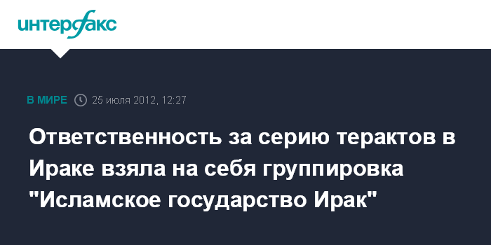 Дубай. 25 июля. INTERFAX.RU - Группировка, называющая себя "Исламское государство Ирак" и имеющая связи с "Аль-Каидой", взяла на себя ответственность за серию терактов в Ираке, которые привели к гибели более сотни людей в различных городах страны.