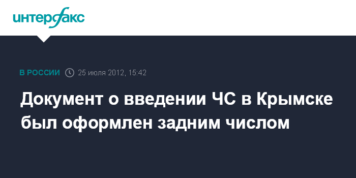 Геленджик. 25 июля. INTERFAX.RU - Документ о введении чрезвычайной ситуации в связи с выпадением обильных осадков в Крымске сфальсифицирован, заявил глава Следственного комитета РФ Александр Бастрыкин. "Тот документ, который нам потом приводили в администрации города - решение номер 14 об объявлении режима чрезвычайной ситуации, связанное с выпадением обильных осадков, - мы установили, что оно сфальсифицировано", - сказал Бастрыкин в среду на совещании по ликвидации последствий наводнения в Краснодарском крае, которое проводит президент РФ Владимир Путин.