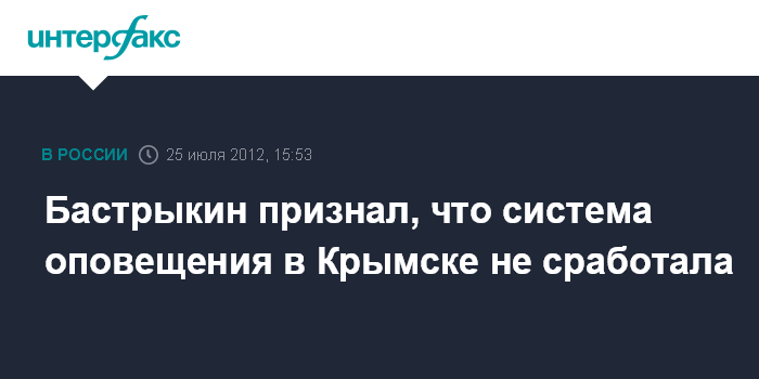 "На сегодня мы имеем свидетельские показания почти 2 тысяч человек о том, что система оповещения практически отсутствовала. На сегодняшний день нами документально установлено, что оповещение из огромного количества жителей получило 52 человека в той части города, где работала автоматизированная система оповещения", - сказал А.Бастрыкин на совещании у президента РФ по ликвидации последствий наводнения в Краснодарском крае.