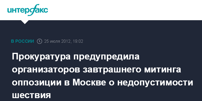 Москва. 25 июля. INTERFAX.RU - Прокуратура предупредила организаторов оппозиционного митинга, который пройдет 26 июля в Новопушкинском сквере Москвы, о недопустимости нарушения закона. "По поступившим в прокуратуру Москвы сведениям, 26 июля гражданскими активистами на Никитском бульваре с 18:00 до 19:00 планируется сбор участников протестной акции, которые планируют в дальнейшем с 19:00 до 22:00 провести шествие от площади Никитских ворот по Тверскому бульвару до Новопушкинского сквера", - сообщили "Интерфаксу" в пресс-службе Генпрокуратуры.