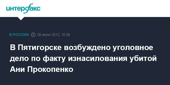 Пятигорск. 26 июля. INTERFAX.RU - Возбуждено уголовное дело по факту сексуального насилия над 9-летней Аней Прокопенко, тело которой было обнаружено возле горы Машук в Пятигорске, сообщило следственное управление СК РФ по краю в четверг.
