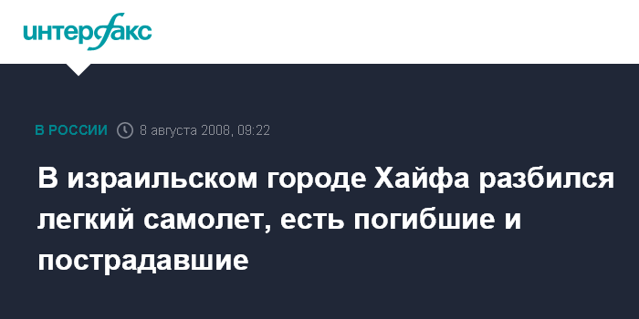 Москва. 8 августа. INTERFAX.RU - Три человека погибли в результате крушения легкого самолета неподалеку от аэропорта израильского города Хайфы, сообщает 10-й канал израильского телевидения.