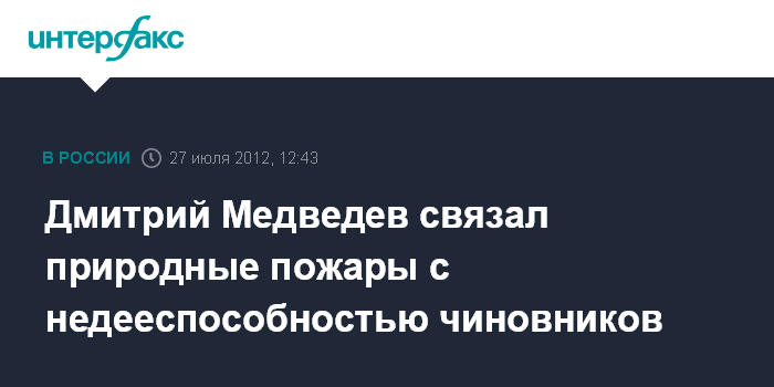 "Конечно, причина происходящего не только в погоде. Зачастую это связано с неспособностью контролировать ситуацию, оперативно принимать решения, своевременно оповещать людей и локализовать очаги возгорания", - заявил Д.Медведев на совещании о ситуации, сложившейся в этом году в субъектах РФ, подвергшихся воздействию аномально высоких температур.
