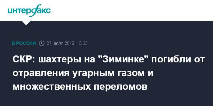 Кемерово. 27 июля. INTERFAX.RU - Установлена причина смерти трех шахтеров, погибших в ночь на пятницу в результате аварии на шахте "Зиминка" в городе Прокопьевске (Кемеровская область), сообщили агентству "Интерфакс-Сибирь" в СУ СКР по региону.