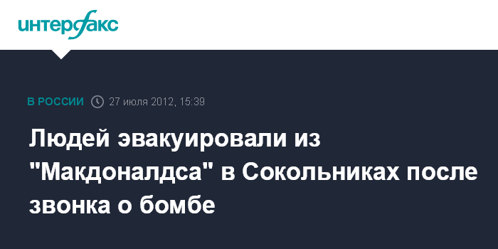 Москва. 27 июля. INTERFAX.RU - Сообщение о минировании ресторана "Макдоналдс" в Сокольниках поступило днем в пятницу, сообщила "Интерфаксу" сотрудник пресс-группы УВД по Восточному округу Москвы Татьяна Петрова.