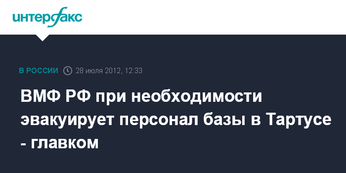 Москва. 28 июля. INTERFAX.RU - Личный состав пункта материально-технического обеспечения (ПМТО) ВМФ России в сирийском порту Тартус при возникновении чрезвычайных ситуаций будет эвакуирован, заявил главнокомандующий ВМФ России вице-адмирал Виктор Чирков. "Если возникнут какие-то чрезвычайные ситуации, то мы будем личный состав из пункта материального обеспечения убирать. В ПМТО есть и командир", - сказал В.Чирков в субботу в эфире радиостанции "Эхо Москвы".