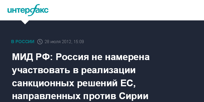 МИД РФ: Россия не намерена участвовать в реализации санкционных решений ЕС, направленных против Сирии