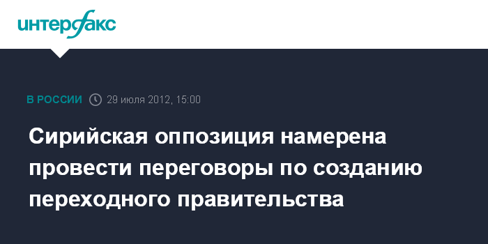 Каир. 29 июля. INTERFAX.RU - Глава оппозиционного Сирийского национального совета Абдельбассет Сида в воскресенье заявил о том, что в течение нескольких предстоящих недель между представителями оппозиции пройдут переговоры по формированию временного правительства Сирии, сообщают местные СМИ. По словам А.Сида, временное правительство сможет заменить правительство действующего главы государства Башара Асада с момент его ухода с поста президента и до проведения в стране выборов.