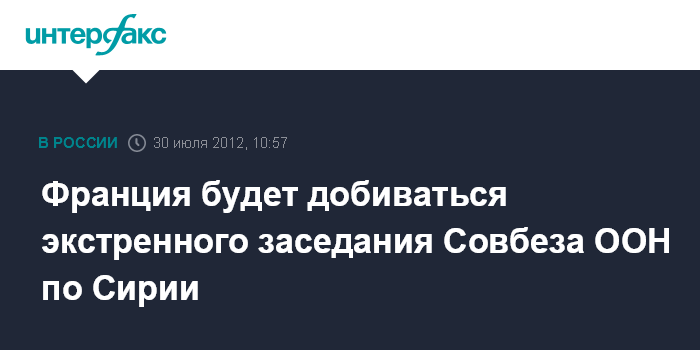Париж. 30 июля. INTERFAX.RU - Власти Франции будут добиваться экстренного заседания Совета Безопасности ООН по сирийскому кризису с момента начала председательства Парижа в Совбезе с 1 августа 2012 г., заявил глава французского МИД Лоран Фабиус в понедельник.