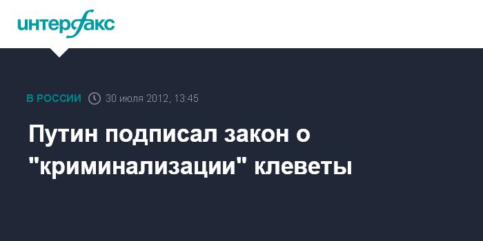 Москва. 30 июля. INTERFAX.RU - Президент России Владимир Путин подписал Федеральный закон "О внесении изменений в Уголовный кодекс Российской Федерации и отдельные законодательные акты Российской Федерации", который устанавливает ответственность за клевету, сообщила в понедельник пресс-служба главы государства.