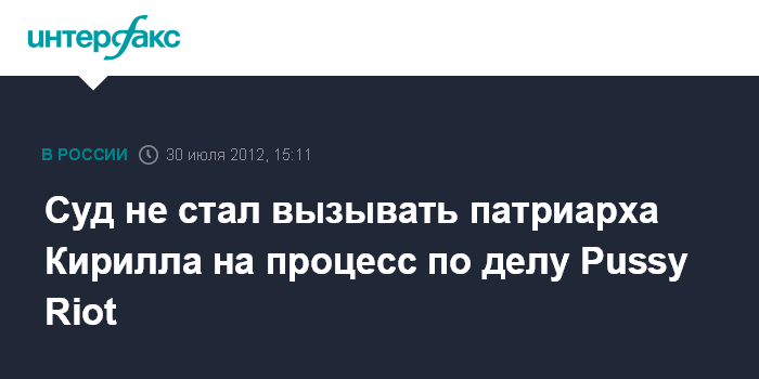 Москва. 30 июля. INTERFAX.RU - Суд отказался вызвать в качестве свидетеля по делу Pussy Riot патриарха Московского и всея Руси Кирилла, а также экспертов-специалистов для участия в слушаниях.