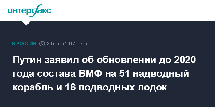 Северодвинск. 30 июля. INTERFAX.RU - Президент России Владимир Путин сообщил, что до 2020 года в состав Военно-морского флота РФ войдет 51 современный боевой надводный корабль.