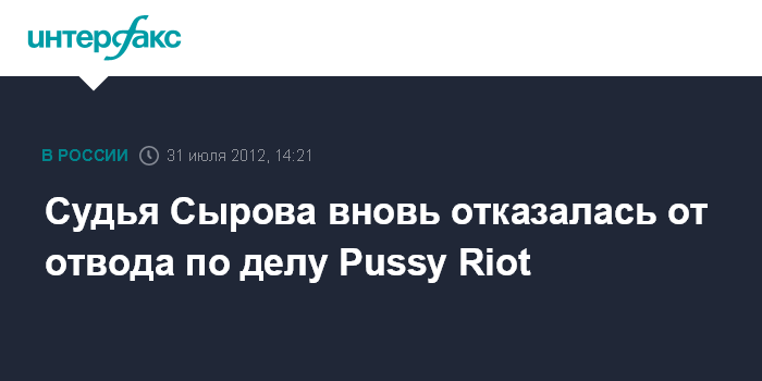 Москва. 31 июля. INTERFAX.RU - Судья по делу Pussy Riot Марина Сырова отказалась взять самоотвод, заявленный ей защитой обвиняемых.