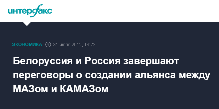 Минск. 31 июля. INTERFAX.RU - Министр промышленности и торговли России Денис Мантуров констатирует, что переговоры между Белоруссией и Россией о создании альянса на базе МАЗа и КАМАЗа вступили в завершающую стадию.