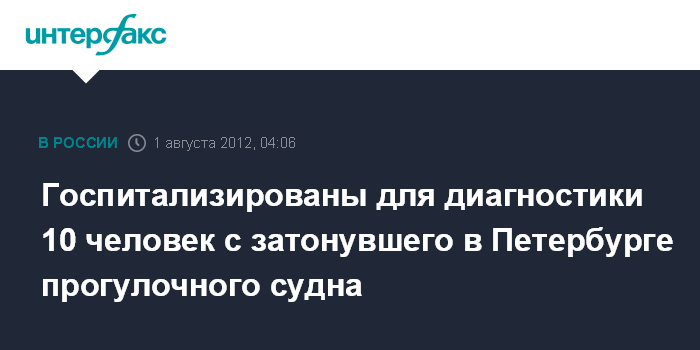 Санкт-Петербург. 1 августа. ИНТЕРФАКС СЕВЕРО-ЗАПАД - Десять человек, находившихся на борту затонувшего в Неве в ночь на среду прогулочного катера, госпитализированы для диагностики, сообщили "Интерфаксу" в главном управлении МЧС РФ по северной столице.