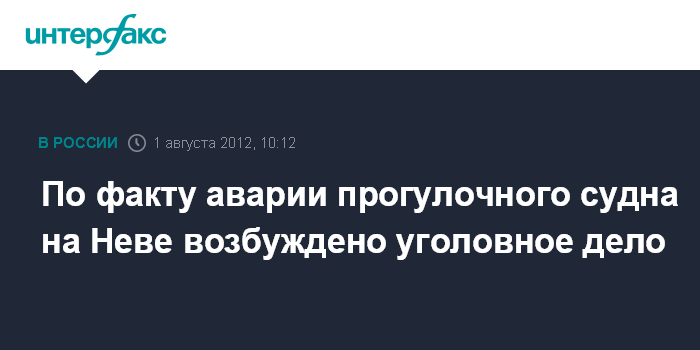 Санкт-Петербург. 1 августа. INTERFAX.RU - Северо-Западное следственное управление на транспорте возбудило уголовное дело по факту аварии с прогулочным судном и сухогрузом на Неве в ночь на среду.