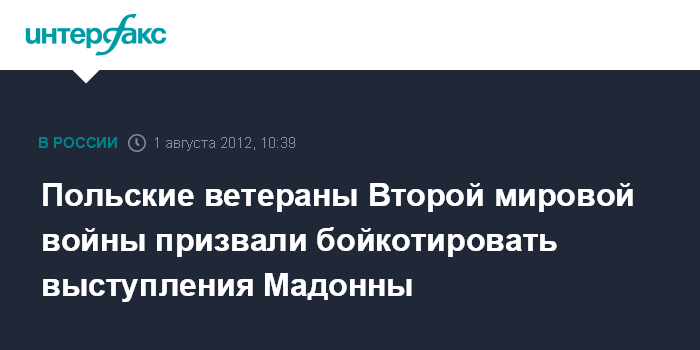 Варшава. 1 августа. INTERFAX.RU - Ветераны Второй мировой войны и религиозные активисты выступили против запланированного на вечер среды концерта американской поп-звезды Мадонны в связи с тем, что дата его проведения совпадает с 68-ой годовщиной Варшавского восстания против нацистов, сообщила в среду польская "Газета выборча".