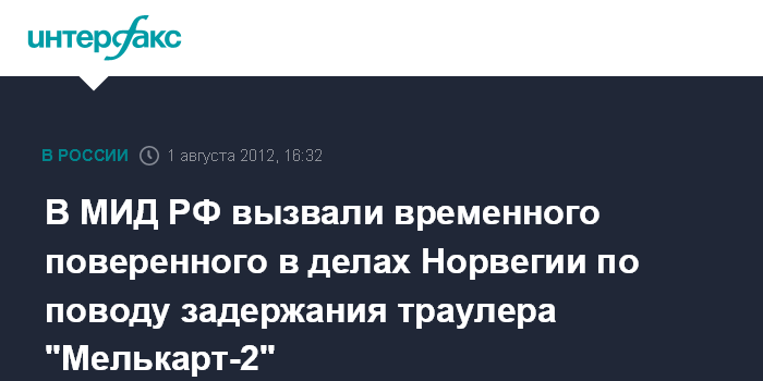 "1 августа в МИД России был вызван временный поверенный в делах Норвегии в Российской Федерации Б.Свендсен, которому была высказана серьезная обеспокоенность в связи с задержанием Береговой охраной Норвегии 22 июля 2012 года в так называемой "рыбоохранной зоне" Шпицбергена российского рыболовного траулера "Мелькарт II", - говорится в сообщении, опубликованном на сайте МИД РФ.