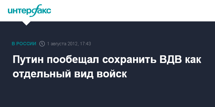 Ульяновск. 1 августа. INTERFAX.RU - Воздушно-десантные войска будут сохранены как род войск в структуре Вооруженных сил России, заявил президент РФ Владимир Путин.