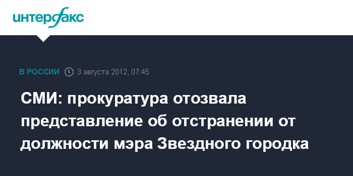 Москва. 3 августа. INTERFAX.RU - Прокуратура, не успев направить депутатам закрытого административного территориального образования (ЗАТО) "Звездный городок" представление о снятии с должности главы ЗАТО Николая Рыбкина с должности, тут же его отозвала, сообщает "Коммерсант" в пятницу.