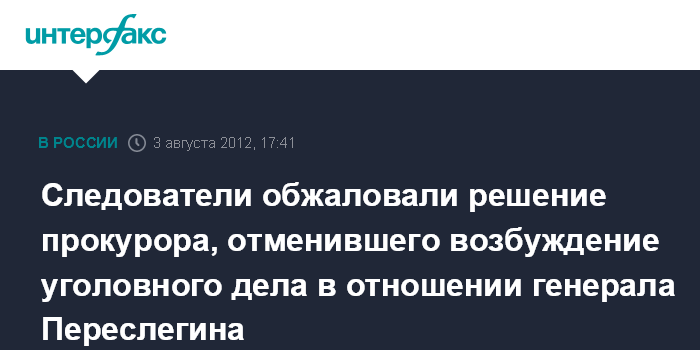 Москва. 3 августа. INTERFAX.RU - Военные следственные органы Следственного комитета РФ обжаловали решение военного прокурора об отмене постановления о возбуждении уголовного дела в отношении в отношении первого заместителя командующего Южным военным округом генерал-лейтенанта Николая Переслегина, сообщает в пятницу пресс-служба Главного военного следственного управления Следственного комитета РФ.
