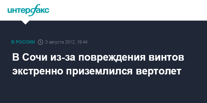 Он отметил, что, по предварительной версии, вертолет сделал экстренную посадку в горах в районе поселка Эсто-Садок по техническим причинам. Пострадавших нет. "У вертолета имеются повреждения винтов", - подчеркнул представитель прокуратуры.