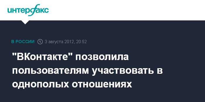 Москва. 3 августа. INTERFAX.RU - Администрация социальной сети "ВКонтакте" позволила пользователям указывать в своих профилях, что они состоят в отношениях с людьми того же пола.