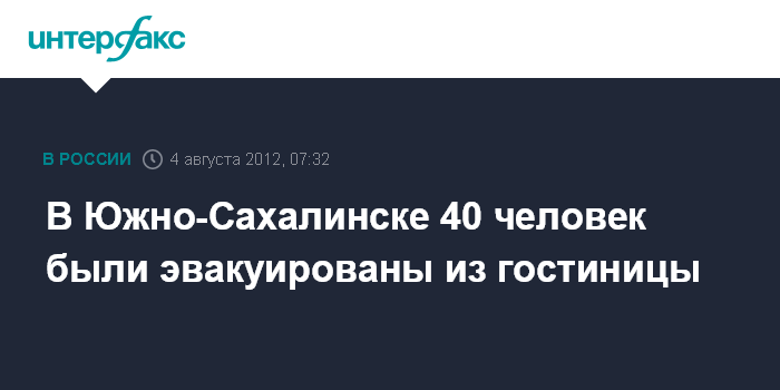 Владивосток. 4 августа. ИНТЕРФАКС-ДАЛЬНИЙ ВОСТОК - Из-за небольшого пожара в кафе при гостинице "Рыбак" в Южно-Сахалинске было эвакуировано 40 человек, сообщает в субботу пресс-служба МЧС по Сахалинской области.