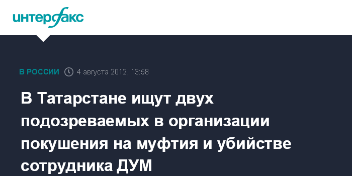 На сайте СУ СКР по Татарстану сообщается в субботу, что разыскиваются Валеев Роберт Равильевич 1976 Г.Р. и Мингалеев Раис Ринатович, 1976 г.р., оба - приверженцы радикального направления ислама. "Следствием установлено, что данными лицами 19 июля было организовано убийство заместителя муфтия духовного управления мусульман Татарстана Валиуллы Якупова, а также покушение на убийство муфтия республики Илдуса Файзова", - отмечается в сообщении управления.