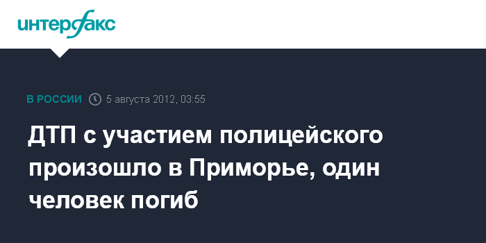 Владивосток. 5 августа. ИНТЕРФАКС-ДАЛЬНИЙ ВОСТОК - Один человек погиб в дорожной аварии с участием сотрудника полиции в Уссурийске Приморского края в субботу, сообщает пресс-служба краевого УМВД.