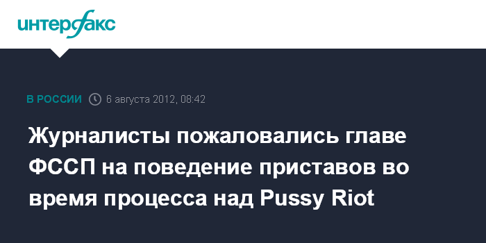 Москва. 6 августа. INTERFAX.RU - Группа журналистов, освещающая процесс над участницами панк-группы Pussy Riot, направила письмо руководителю Федеральной службы судебных приставов (ФССП) Артуру Парфенчикову с жалобой на поведение приставов во время суда, сообщает "Коммерсант" в понедельник.
