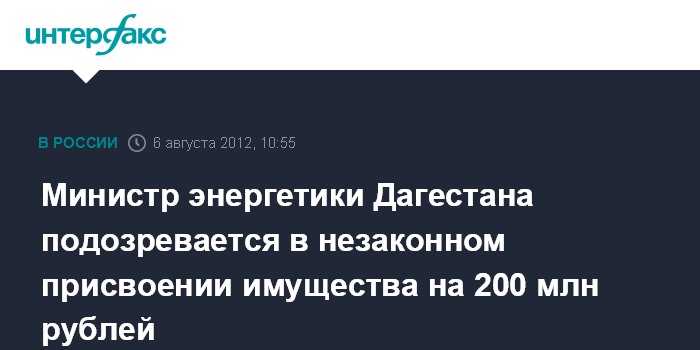 Москва. 6 августа. INTERFAX.RU - Министр промышленности, энергетики и связи Дагестана стал фигурантом уголовного дела о незаконном присвоении имущества газовых сетей.