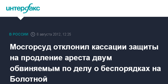 Москва. 6 августа. INTERFAX.RU - Мосгорсуд признал законным продление ареста до 6 ноября фигурантам дела о массовых беспорядках на Болотной площади Максиму Лузянину и ученому- химику Федору Бахову.