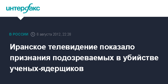 Тегеран. 6 августа. INTERFAX.RU - Иранское государственное телевидение показало показания 14 иранцев, причастных, как утверждается, к убийству пяти ученых-ядерщиков.