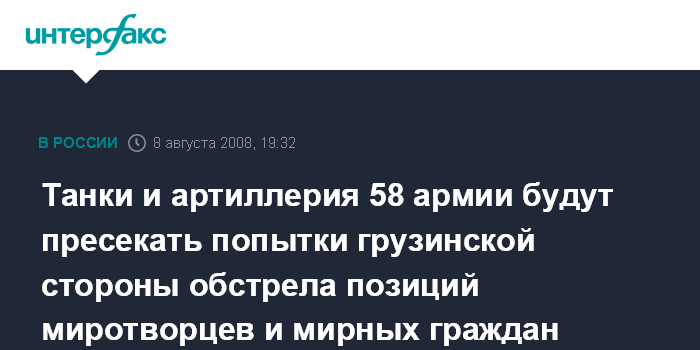"Грузинские войска, вошедшие в Южную Осетию, находятся в зоне поражения огневых средств подразделений 58-й армии. В дальнейшем любая стрельба в зоне ответственности российских миротворцев будет жестко пресекаться", - заявил помощник главкома Сухопутных войск.