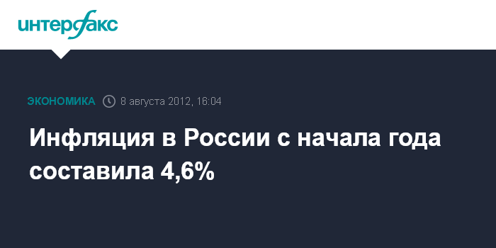 С начала года инфляция к 6 августа составила 4,6% против 5% на аналогичную дату прошлого года (первую неделю августа инфляция в 2011 году была нулевой, а в целом в августе прошлого года была зафиксирована дефляция в 0,2%). Как сообщалось, инфляция в РФ в июле 2012 года составила 1,2% после 0,9% в июне.